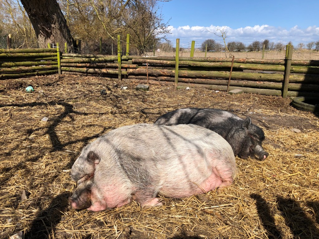 Jeg fik for eksempel at vide, at grise altid skal have adgang til et vandhul. For grise kan ikke svede, så de skal køle sig ned i vand. Og jeg har lavet utallige vandhuller, men problemet er, at Dolly og Alexis åbentbart begge hader vand. For får de bare en dråbe vand på sig, hyler de som, ja, en stukken gris, og løber deres vej.