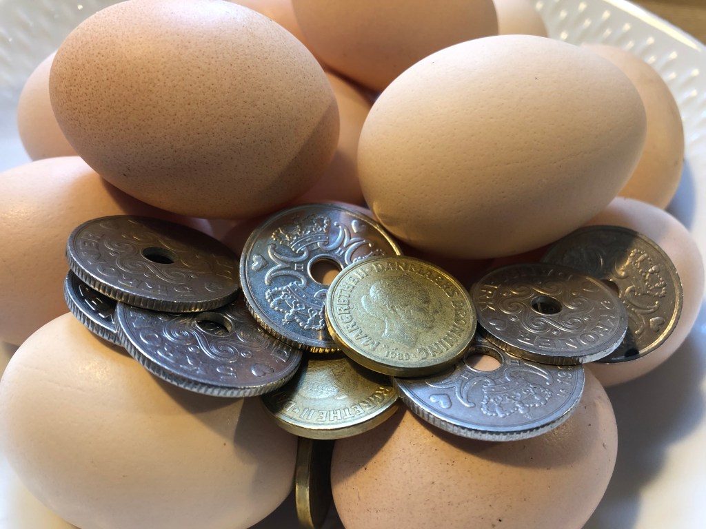 Det jo ikke vanvittigt meget, de kan bidrage med, men mange høns giver jo æg en gang imellem, så derfor har jeg prøvet at indføre “ægonomien,” som jo er en naturalie-økonomi.